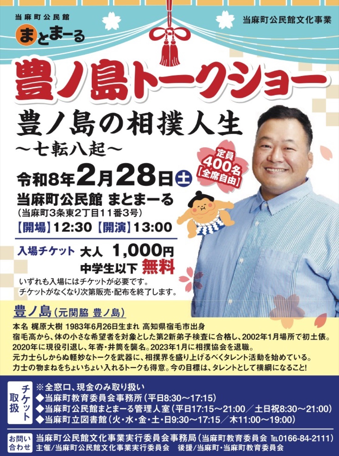 | 料金・費用 | 定員400名【全席自由】 大人1,000円 中学生以下無料 |