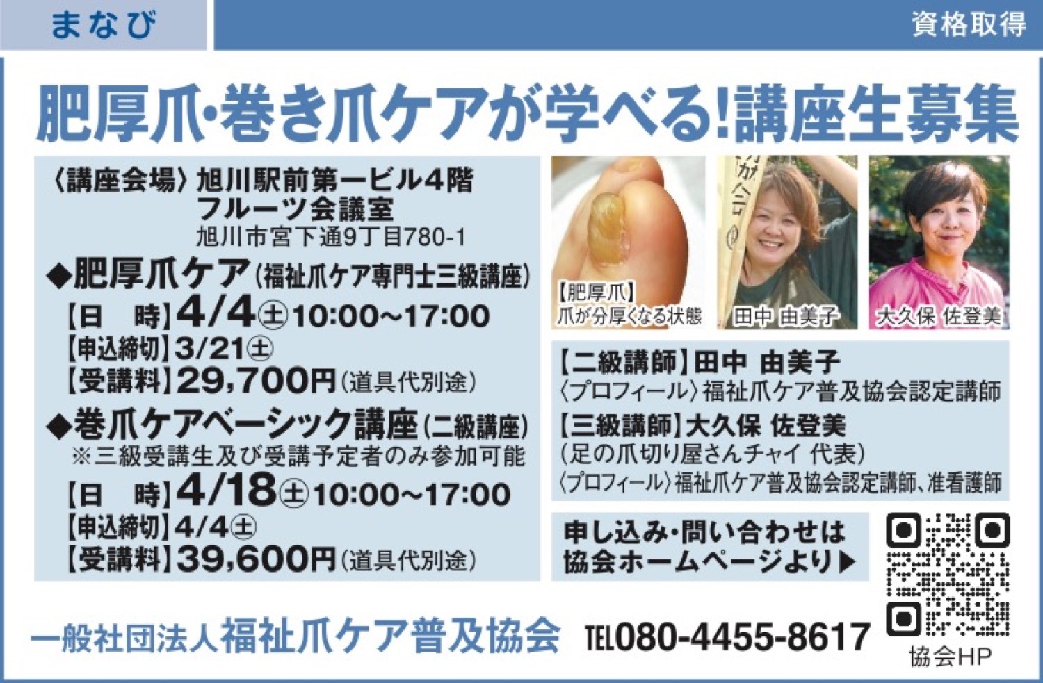 | 料金・費用 | ◆肥厚爪ケア(福祉爪ケア専門士三級講座) 【受講料】29,700円(道具代別途) ◆巻爪ケアベーシック講座(二級講座) 【受講料】39,600円(道具代別途) |