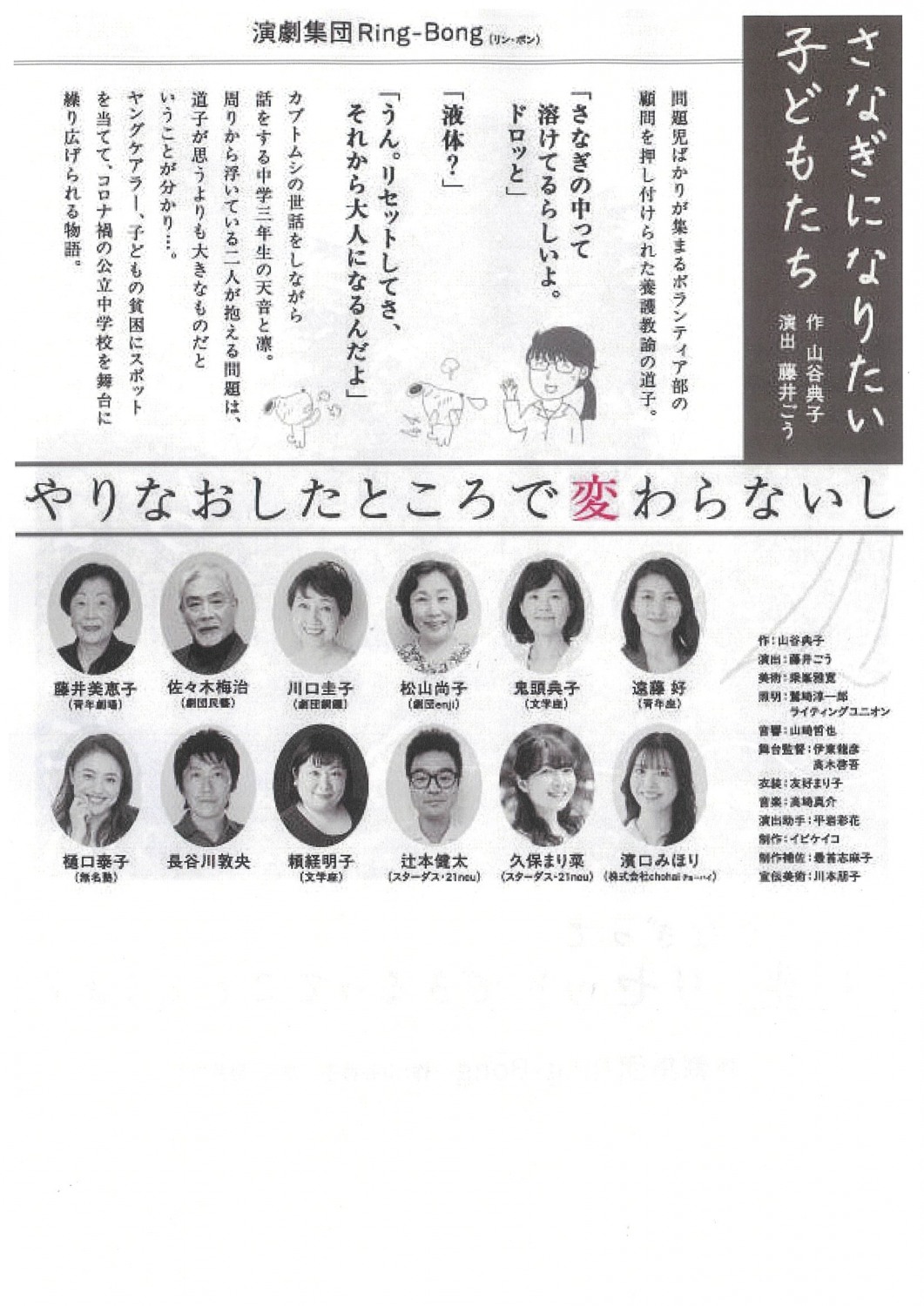 問題児ばかりが集まるボランティア部の顧問を押し付けられた養護教諭の道子。カブトムシの世話をしながら話をする中学三年生の天音と凛。周りから浮いている二人が抱える問題は、道子が思うよりも大きなものだという事が分かり…。ヤングケアラー、子どもの貧困にスポットを当てて、コロナ禍の公立中学校を舞台に繰り広げられる物語。(作:山谷典子 演出:藤井ごう)
