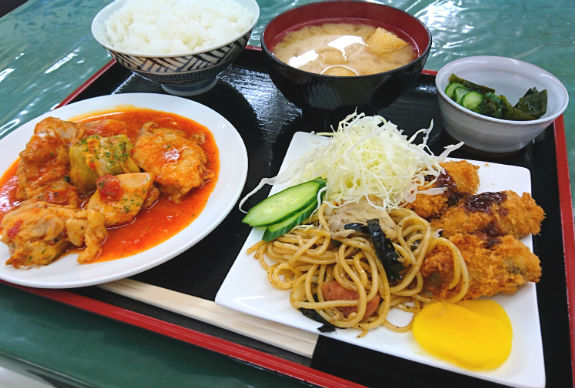 写真は本日のバイキング。鶏肉とロールキャベツのトマトソース煮をメインに、牡蠣フライ、和風パスタ、きゅうりとワカメの酢の物、キャベツの千切り。味噌汁には揚げと豆腐、エノキが入っていました。