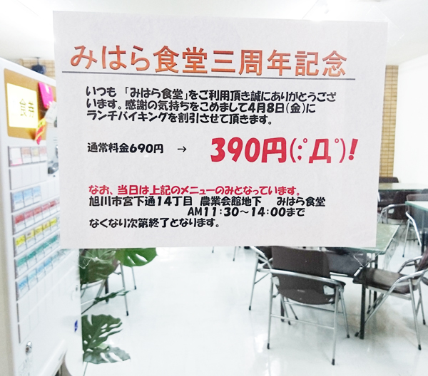 農業会館(旭川市宮下通14)地下の「みはら食堂」が4月8日(金)、3周年を記念してランチバイキング通常690円のところ、390円で提供します。