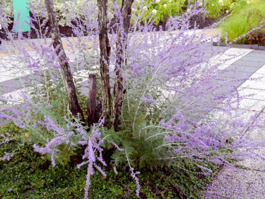ロシアンセージは、低木状の多年草です。シルバーグリーンの葉に、ベルベットのような質感の青紫色の小花をたくさん咲かせ、ふんわりとした柔らかさとボリューム感があります。花や茎葉には、ミントに似た爽やかな香りがあるのも魅力です。