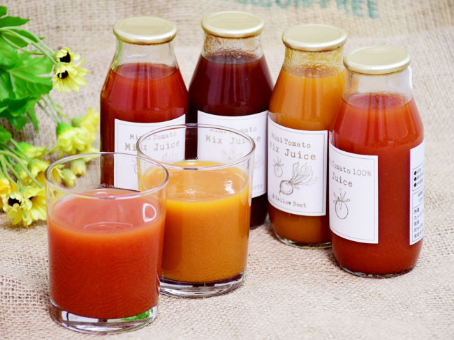齋藤夫妻が作るミニトマトは、オーガニック認証を受けた誠実な味。規格外品も無駄にせず、4種のトマトジュースに仕上げています。長期保存ができるため贈り物にもぴったり。