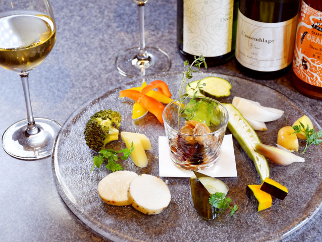 季節の野菜たちがそれぞれにハーブやスパイスの配合を変えたピクルス液に漬けこまれ、華やかに、軽やかにドレスアップを果たしました。どれからいこうか迷い箸、ならぬ迷いフォーク…。カボチャはシナモンで少しデザート風に。お豆とアサリは、ひと瓶まるごとほしくなるほどの常習性。シャインマスカットは柔らかな酸味がいっそう甘さを引き立てます。この清らかな味と彩りに添えるなら、冷えた白ワイン。季節を感じながら、大切にいただきたい一品です。1500円。