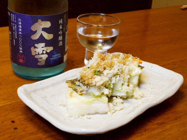 荒漬けした白菜に麹をまとわせ3~4日。てっぺんには、すりたての道産山わさびをたっぷりと。昆布とにんじん旨みが染みた瑞々しい白菜からは、優しい甘みがじんわり広がっていく。そこに醤油をひとたらし。ツーンと鼻に抜ける辛みを、まろく溶けた麹がふんわり包み込む…。素朴だが奥深い、故郷の良さを伝えてくれる味わいだ。そうとなれば、合わせる酒はやはり地元の純米吟醸。嘘のない味で、どさんこ魂をゆさぶる。白菜こうじ漬440円。(庭田)
