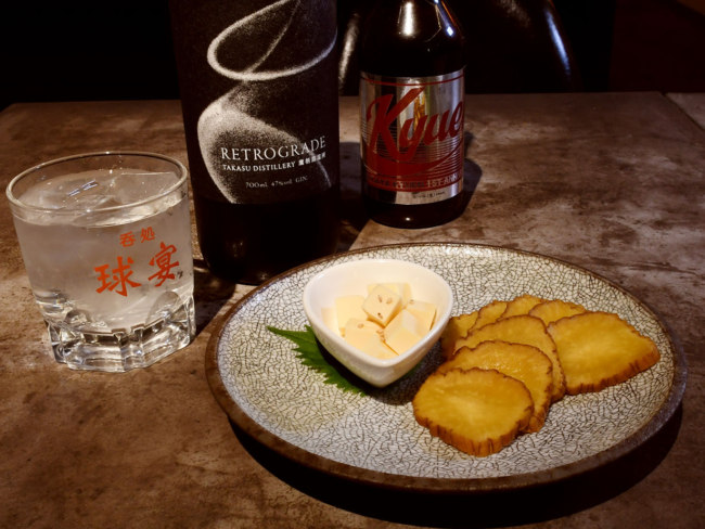 独自にブレンドした白味噌に、クリームチーズを2週間じっくり漬け込む。水分が抜けたぶん、旨みをしっかり吸い上げるから、ねっとり濃厚な仕上がりだ。噛むほどに広がる華やかな香り、余韻の長さは秀逸。これだけでも主役級だが、しかしここで容赦はしない。いぶりがっこと合わせれば…?そう、無敵だ。燻香をまとったたくあんのポリポリ感に、麹の豊かな風味が重なって、こいつは杯が進む。特に炭酸系の酒が合うようだ。今日は鷹栖のジンでいこう。700円。