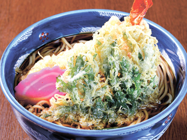 創業時から変わらない、出汁のきいたつゆが自慢。北竜町産更科そば粉と道産小麦を配合した自家製そばは、真っ白な見た目とのど越しが魅力です。ぜひ大海老天(1尾470円)を添えて。