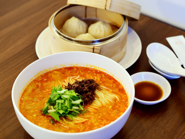 7種のスパイスをブレンドした自家製スープの担々麺は、歯切れのよい中細麺がスープの旨みを引き立て、水菜と豚ひき肉の食感がアクセントに。