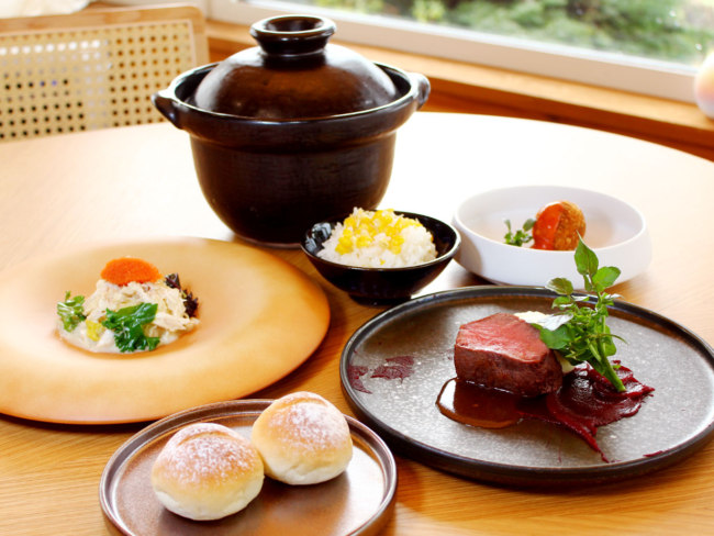森に佇む完全予約制のレストランでは、美瑛産食材を主役にしたコースのみを提供し、その日その一組のためだけに考えられた料理が並びます。