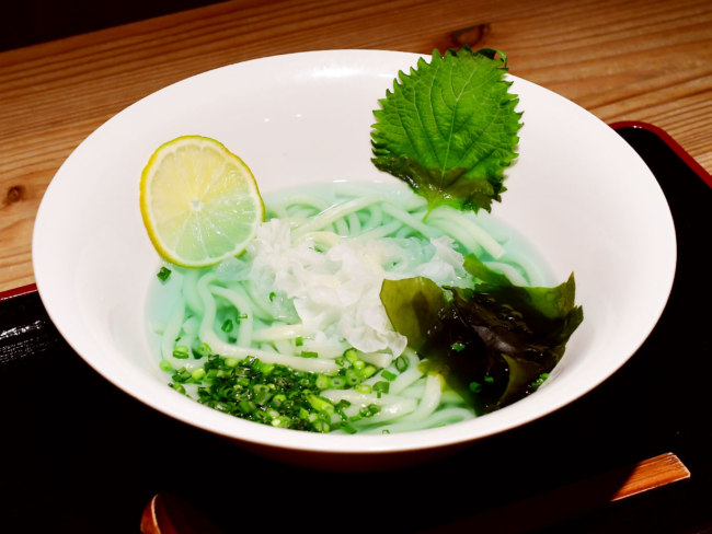 青いつゆが印象的な関西風うどんは、名所の木々をイメージしたライムとシソのさわやかさに出汁の香りが重なって、涼し気な見た目をいい意味で裏切る、奥行きのある味わいです。