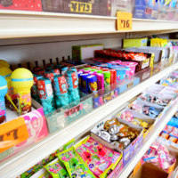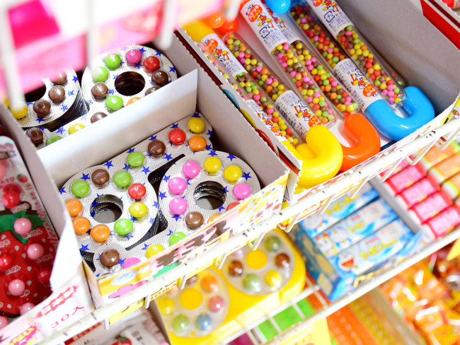 1982年創業の店内には、カラフルなチョコレートやロングセラーのスナック菓子が100種類以上並びます。