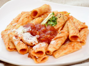 パルメザンのトマトリガトーニ 429円もちもちとした食感で食べ応えのあるリガトーニに、じっくり煮込んで旨みを引き出した自家製トマトソースと薄削りのパルメザンチーズが濃厚にマッチ。追いチーズでさらに深みを足して味わうのもいいな。