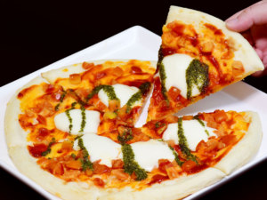 トマトたっぷりマルゲリータ(ホール) 753円もっちりと程よい厚みの生地にイタリア産トマトソース、パプリカ、モッツァレラチーズを載せ、バジルソースをたっぷりと。ハーフカットや1ピースのサイズもあるので、様々なシーンで主役になれそうだ!