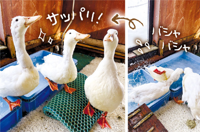 きょうは「26(ふろ)の日」。「動物たちも意外にきれい好き」と教えてくれたのは、こども牧場の担当・佐賀さんです。体を清潔に保つため、アヒルは水浴び、ニワトリは砂浴びをします(ブタの泥浴びも!)。「アヒルは私たちが触れると、必ず水浴びや羽繕いを入念にするんです。よっぽど触られるのが嫌なのか…」と佐賀さん。