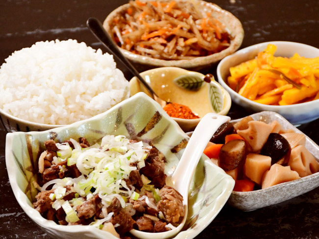 系列の焼き肉店で扱う肉で作る唐揚げやネギだれ竜田などランチは6種類、全880円。日替わりの副菜は3~4品用意され、ご飯と共にセルフで量を調整できます。リーズナブルにしっかりお腹を満たせると好評!