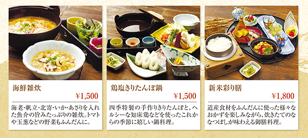 新米の美味しさをそのまま堪能できる御膳を1品、アレンジ料理を2品ご用意しました。きりたんぽは毎日炊き立てのななつぼしから1つ1つ丁寧に手作りしており、寒い時期にぴったりの鍋料理です。