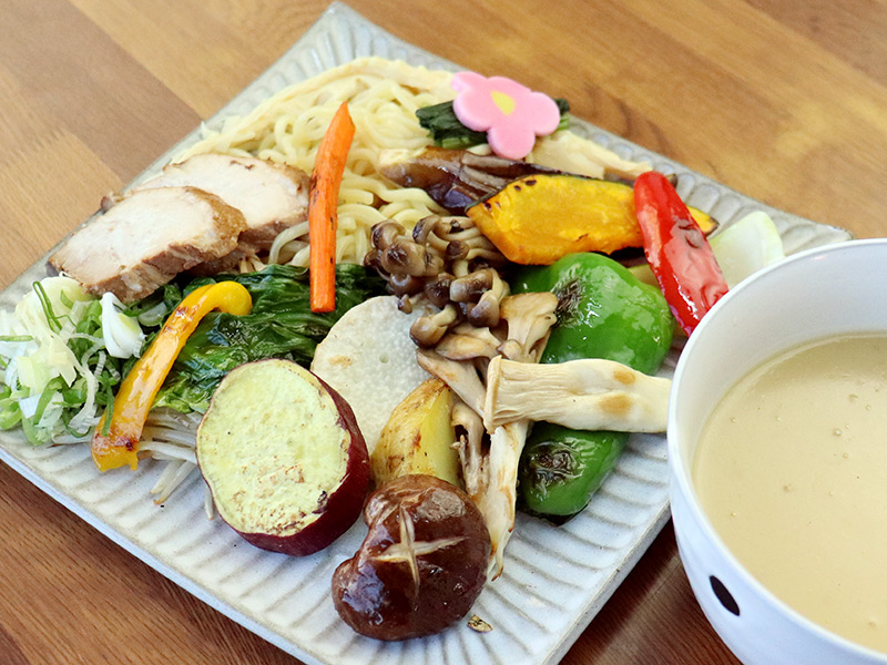 彩り豊かな旬の野菜が最低でも13種類以上。素焼きして甘みを増した野菜と、鶏白湯に煮干しの旨みを加えた濃厚なつけダレの相乗効果を楽しめます。このつけダレの凄さは、野菜に応じて味の印象を変えること。丁寧な仕事から生まれる雑味のないまろやかな味わいで、甘みやほろ苦さ、香りといった、野菜それぞれの魅力をさらに引き出します。