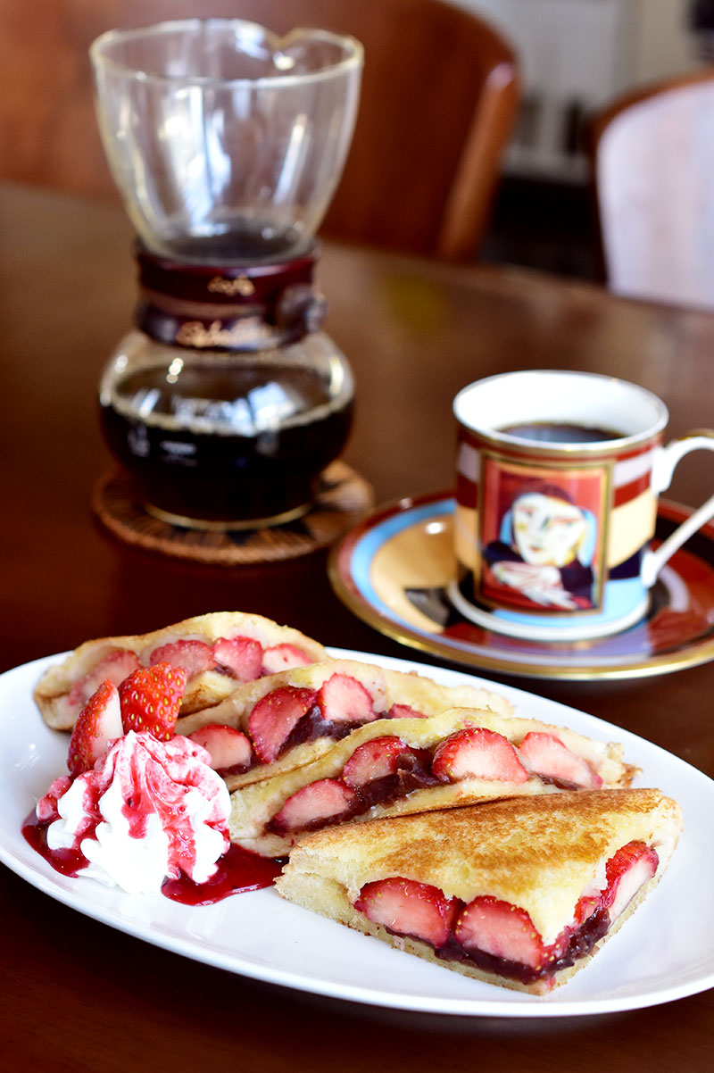 パンにたっぷりの国産いちごとあんこ、そしてまさかのおもちをイン。いちごを温めすぎないよう火加減に注意しながら、きつね色になるまで焼き目つけました。マーガリンの風味が香ばしく、表面はサックサク。いちごの酸味と、あんこの甘さ、マーガリンの塩気は、誰もが知るあの絶妙なバランスです。いちごシロップがたっぷりかかった生クリームにつけて召し上がれ。680円。注文を受けてから一杯一杯淹れるドリップコーヒーとの相性も抜群です。