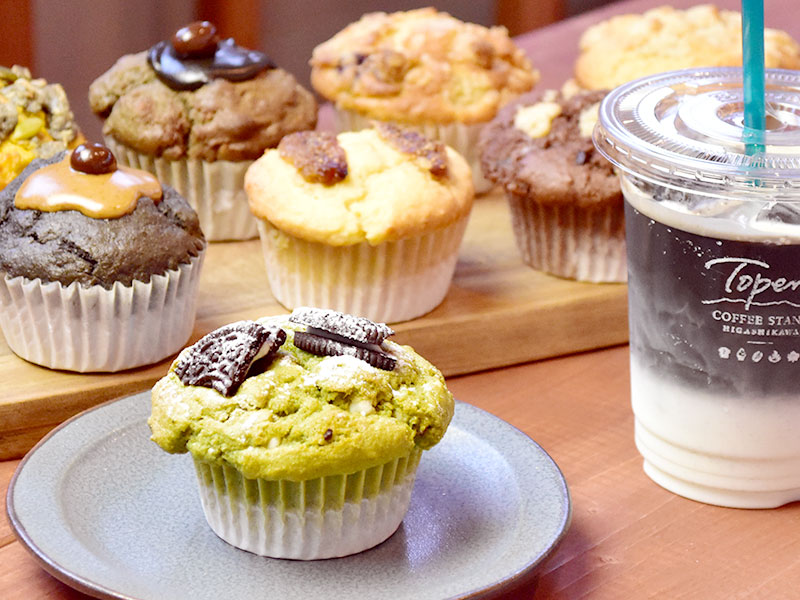 マフィンはレギュラーで7種類。オートミールクランブルの歯触りが楽しい「ブルーベリー」、竹炭で色と風味を付けた「コーヒー」など個性豊か。一番人気は「抹茶オレオ」で、ほんのり渋みが利いた芳醇な香りに、ホワイトチョコの甘み、ほろ苦いビスケットのトッピングが絶妙な組み合わせです。ボリューミーながら、おからや豆乳がベースのため、あっさりと軽い仕上がり。自家焙煎コーヒーやソイラテと一緒に、今日も良きブレイクタイムを。各280円(ドリンクセット780円)。いずれもテイクアウトのみ。