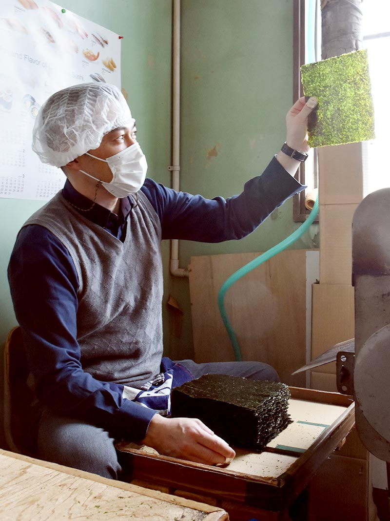 現在の取引先はおもに寿司屋で、密度が高く旨みが濃い海苔は風味を引き出すように軽く焼き、米の水分に長くあたる回転寿司用には強めになど、店ごとのリクエストに応じて丁寧に仕上げます。
