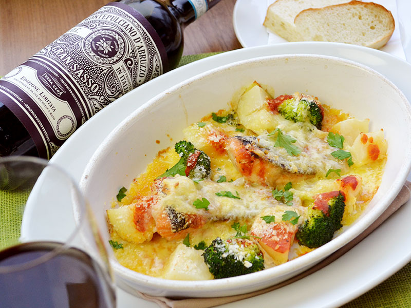 上川町の大雪漁協生産組合から仕入れたニジマスは、川魚ながら臭みはなくふわっと柔らか。フライパンで皮をパリッと焼いたあとに、トマトソース、ガーリックバター、チーズ、香草パン粉をのせて野菜と一緒にオーブンへ。あっさりと淡白な身がニンニクの風味とチーズの芳醇な味わいをまとい、ワインが進む一皿に仕上がりました。