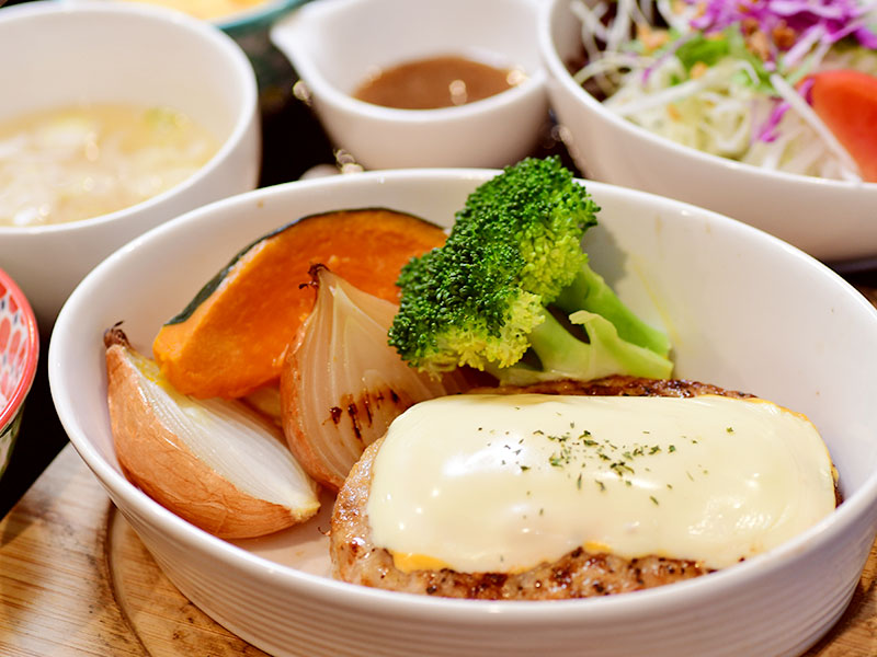 このハンバーグをスチームオーブンでふっくら焼き上げ、カマンベールとゴーダの2種類のチーズをトッピング。ソースをかけなくても、肉の旨みとチーズのコクだけで十分なうまさがあふれ出ています。オーブンで焼いて、甘みが凝縮した野菜もすべて美瑛産。