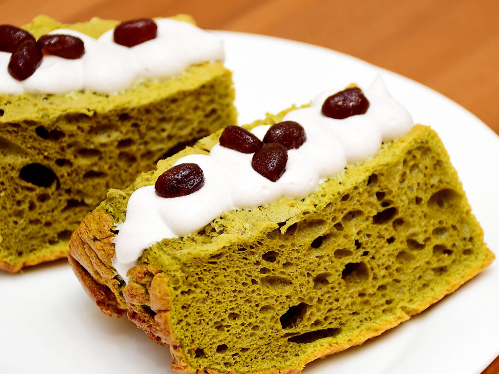 土台のシフォンケーキは抹茶味。たっぷり挟んだクリームには、砂糖の代わりに自家製のこしあんを合わせています。このコクのある生クリームに負けないよう、シフォン生地は一般的な卵黄を使ったレシピではなく、卵白のメレンゲだけで、もっちりとした食感に仕上げました。ふむふむ、どうりでフォークを入れた時にしっかりとした弾力を感じるわけです。