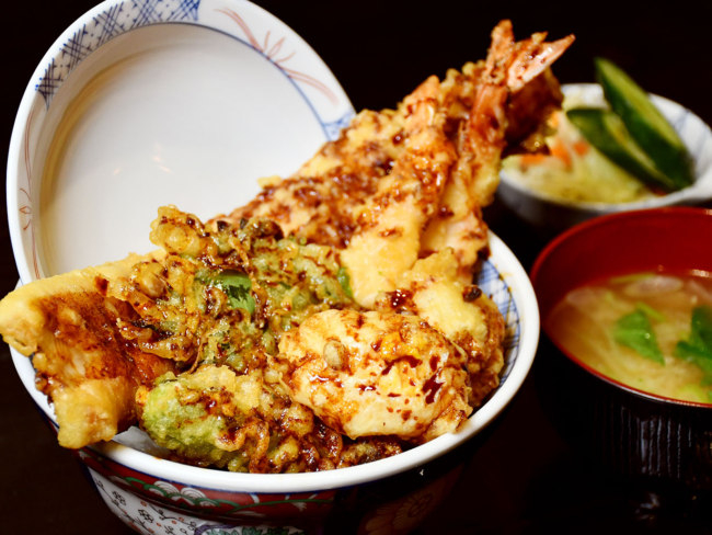 ひと目で心を奪われたこのビジュアル。器からはみ出る大アナゴに、エビが2尾、そして真フグと大盤振る舞い!甘めの自家製ダレをまとったアナゴは、ふっくら柔らかな白身からえもいわれぬ甘みが広がります。もちろんエビもフグも丁寧な仕事ぶりで、味わいは推して知るべし。一人前1600円。