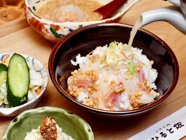 実はこの料理、+200円で鯛出汁を付けることができます。炙った鯛のアラからとった白濁スープをご飯に注げば…なんと贅沢な天茶に早変わり。どうぞ一杯で二度、楽しんで。