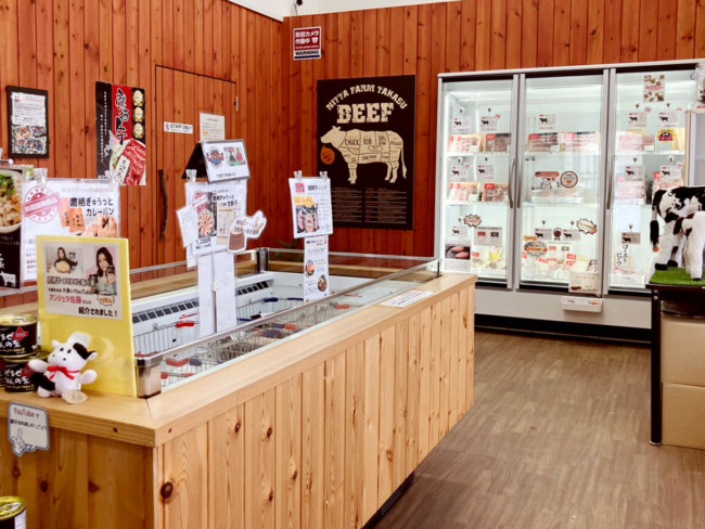 自社で肥育した鷹栖牛の精肉をはじめ、冷凍餃子やハンバーグといった加工品も販売。このほか鷹栖牛を使った軽食・テイクアウトフードもあり 店舗情報