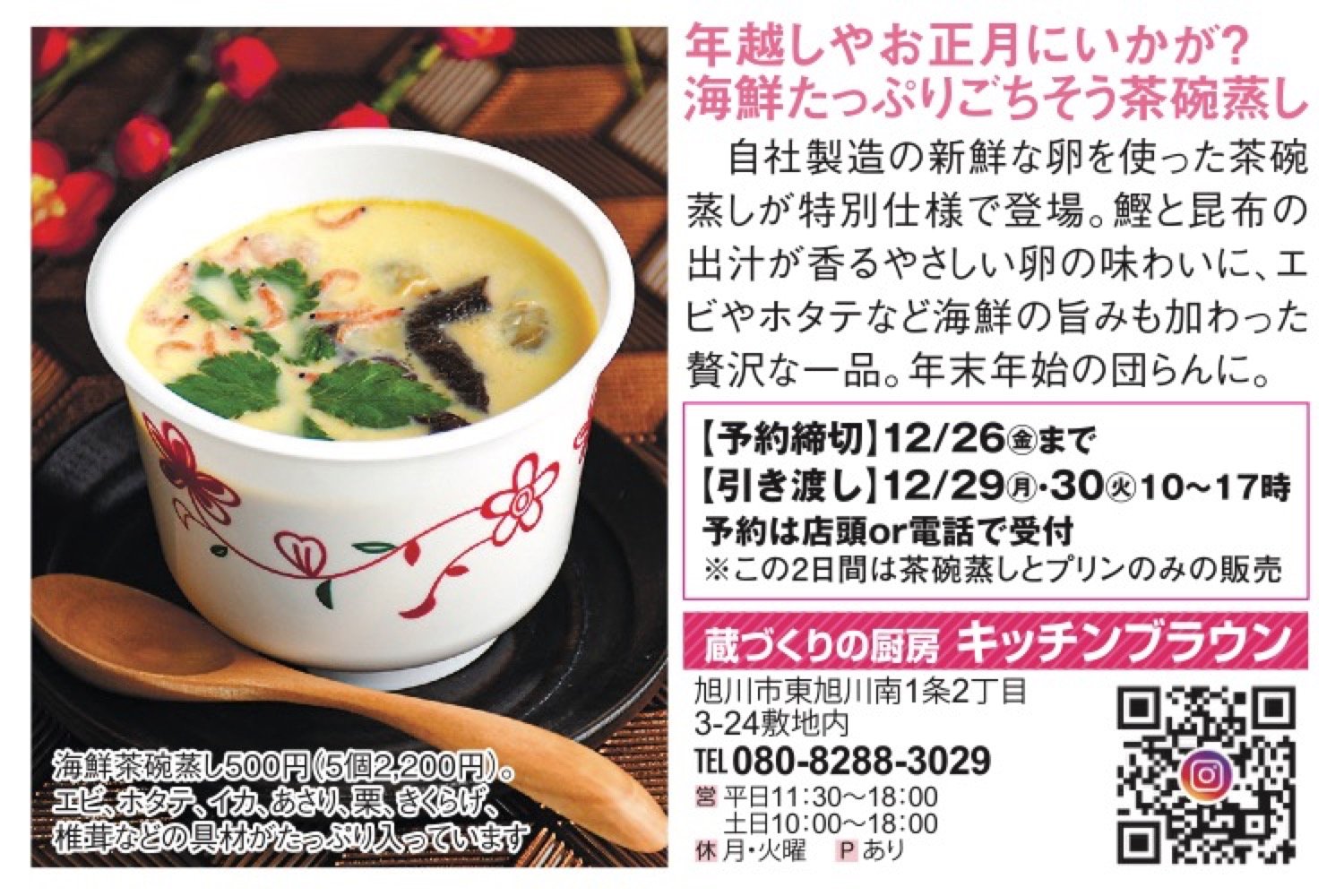 米蔵を改装したお店で、茶碗蒸し、プリン、だし巻き卵などの卵料理を販売しています。東旭川のドームファクトリーが手掛ける、新鮮な平飼い卵や採れたてのきのこを使用して手作りしています。その他、冬季限定でおでんの販売も。