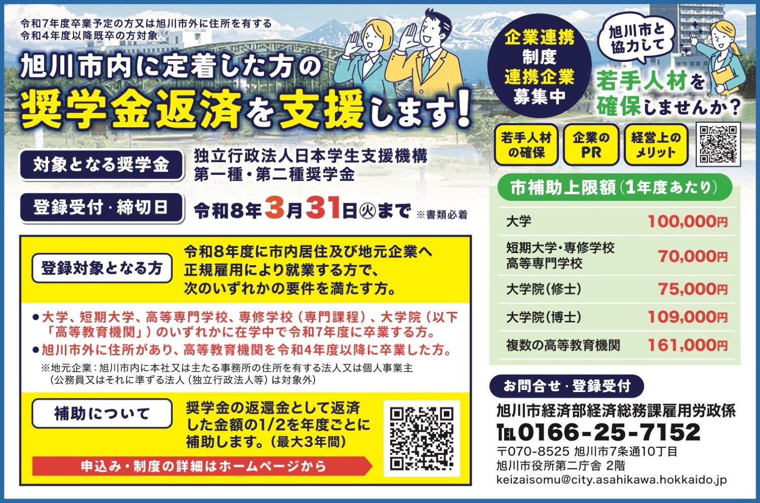 - 旭川市内に定着した方の奨学金返済を支援します!