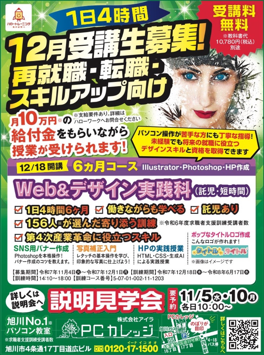 ハロートレーニング急がば学べの無料の職業訓練 道北初のWeb&デザイン講座開講 (託児付き) 完全個別のマンツーマンの講座、小学生からのプログラミング講座、シニアの学び世代講座、MOS試験取得のための通い放題コース、など No1パソコン教室 株式会社アイラPCカレッジ旭川校 無料体験実施中 担当大宮 フリーダイヤル0120-17-1500 お気軽にどうぞ(強引な勧誘はありません)
